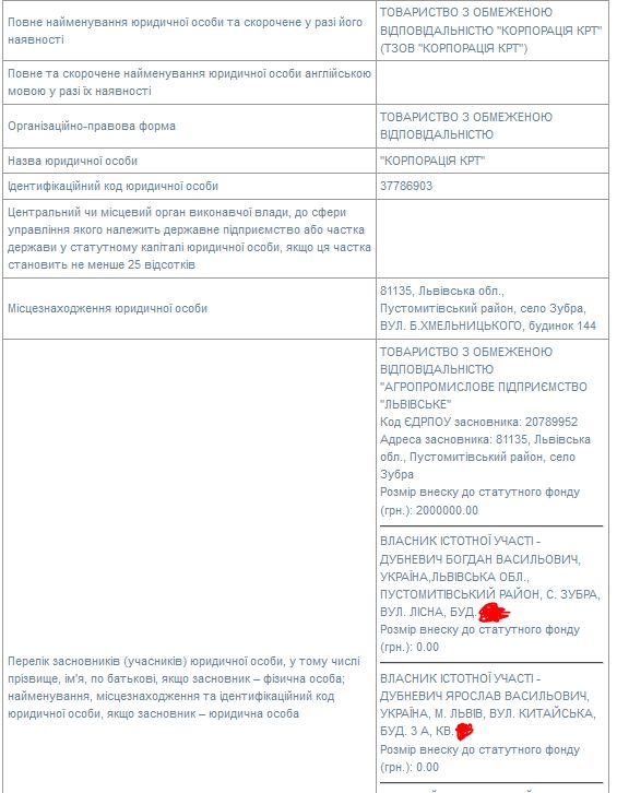 Засновником «Корпорації КРТ» є ТОВ «Агропромислове Підприємство «Львівське». Бенефіціарними власниками компанії є народні депутати Богдан і Ярослав Дубневичі з Львівщини («Блок Петра Порошенка»).