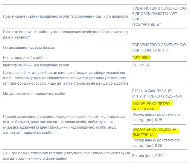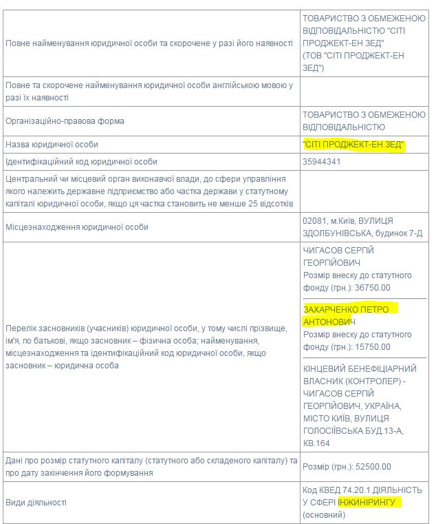 Однак, згідно з даними ЄДРПОУ, Петро Захарченко має частку у двох компаніях. Перша – ТОВ «Сіті Проджект-ен Зед», компанія займається інжинірингом, тут екс-чиновник має 30%. Друга фірма – ТОВ «Арт-віль» (раніше «Фірма Зір»), основний вид діяльності котрої – архітектура. Цю компанію Захарченко заснував ще в 90-х разом з дружиною, наразі вони володіють фірмою навпіл.
