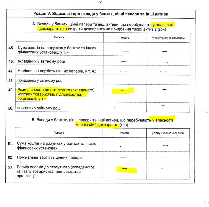Згідно з затвердженою формою подачі декларації про доходи, Захарченко мав надати інформацію про розмір внесків до статутного капіталу товариства, підприємства або організації – своїх та своєї родини. Згідно з декларацією за 2014 рік, Петро Захарченко та його дружина не мають внесків до статутного фонду жодного підприємства.