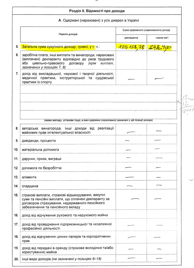Згідно з декларацією, за 2014 рік Захарченко заробив 125 тис грн. Дохід його дружини склав 242 тис грн.