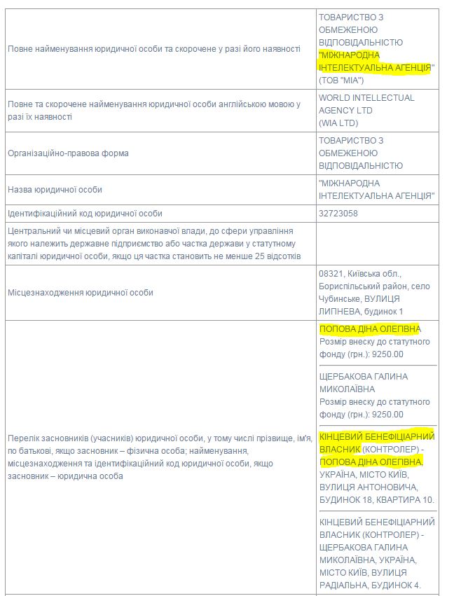 Утім, згідно з даними ЄДРПОУ, Діана Попова є співвласницею ТОВ «Міжнародна інтелектуальна агенція». Цю фірму Попова заснувала у 2003 р. разом з Галиною Щербаковою, частка чиновниці в статутному капіталі складає 50%.