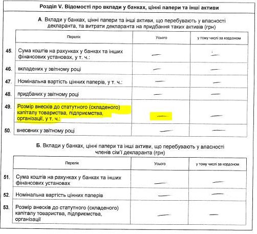 Згідно з затвердженою формою подачі декларації про доходи, Попова мала надати інформацію про розмір внесків до статутного капіталу товариства, підприємства або організації – своїх та своєї родини. Однак у декларації чиновниці за 2014 р. у цьому розділі стоїть прочерк.