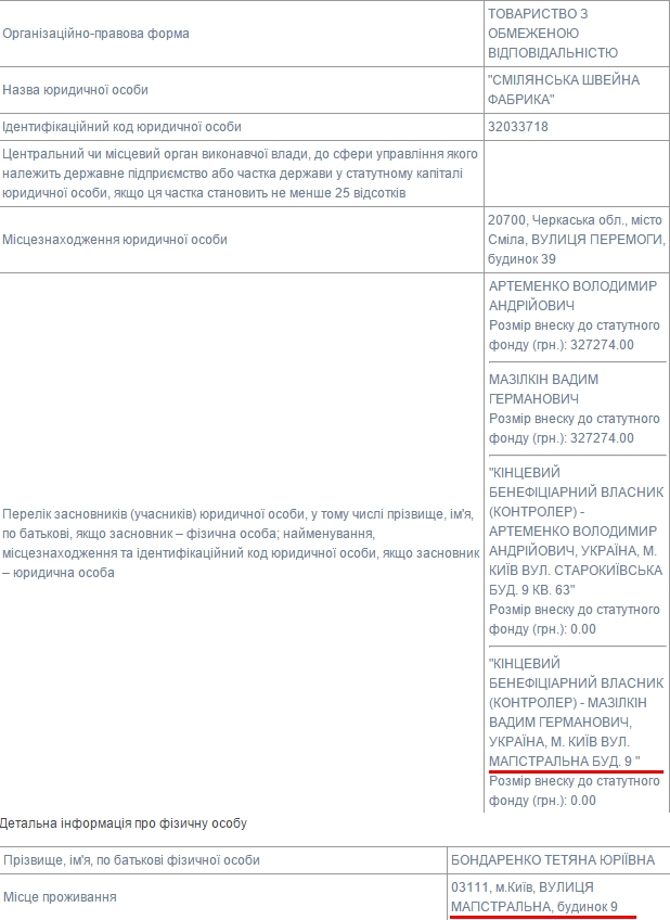 «Смілянська швейна фабрика» належить Володимиру Артеменку і Вадиму Мазілкіну. Згідно держреєстру, останній прописаний в Києві по вул. Магістральній, буд. 9. Це приватний сектор, і за цією ж адресою прописана ФОП Бондаренко Тетяна Юріївна, яка виступила єдиним конкурентом швейної фабрики на тендері.