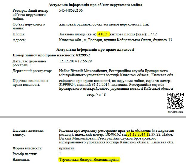 Згідно з витягом із Реєстру майна, право власності Валерії Тарчинської на нерухомість було посвідчено 31 грудня 2014 р. Адреса будинку, згідно з рішенням Броварської міськради, була присвоєна 9 грудня 2014р.