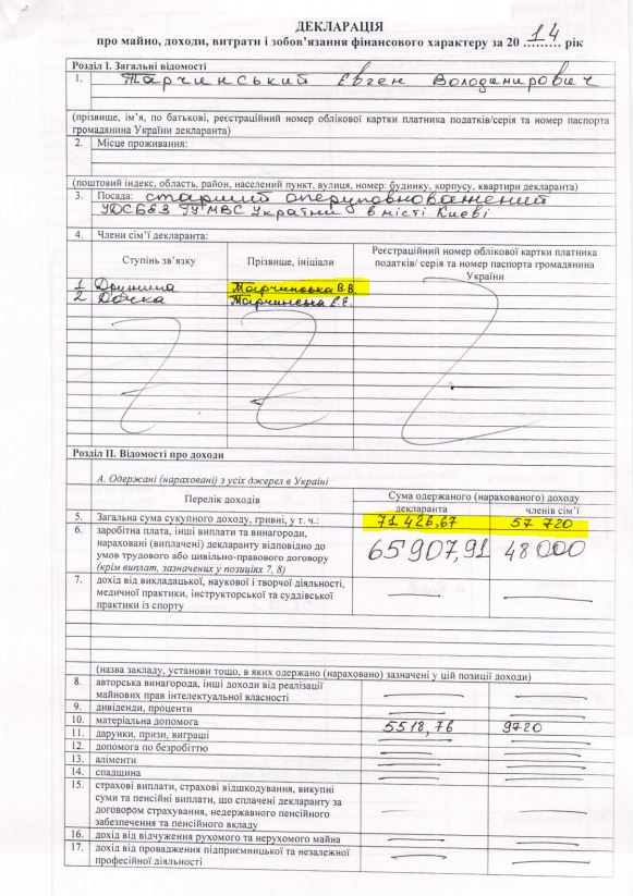 Старший оперуповноважений Управління протидії злочинності у сфері економіки в місті Києві Євген Тарчинський не вказав у декларації про доходи за 2014 р. будинок своєї дружини у Броварах. Про це стало відомо із Реєстру речових прав на нерухоме майно.