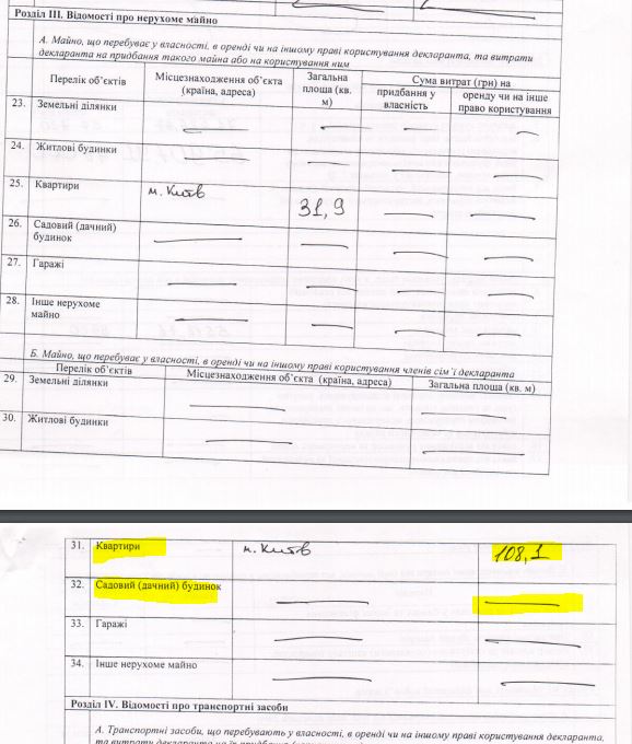Згідно з декларацією за 2014 рік Євгеній та Валерія Тарчинські разом заробили близько 129 тис грн. У розділі про нерухомість Тарчинський вказав, що сам володіє квартирою на 31 кв.м., а родині належить квартира площею 108 кв м, але жодних даних про будинок на 410 квадратів у декларації немає.
