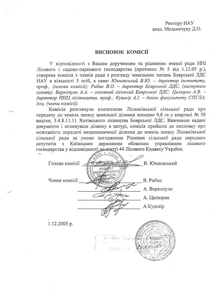 Зокрема, згідно із протоколом № 8 засідання Вченої ради Національного аграрного університету від 5.04.2006 р., більшістю голосів Вченої ради було ухвалено, на підставі рішення вченої ради інституту ННІ лісового і садово-паркового господарства НАУ та рішення Комісії Боярської ЛДС надати згоду на вилучення земельної ділянки 9,8 га зі складу земель Хотівського лісництва.