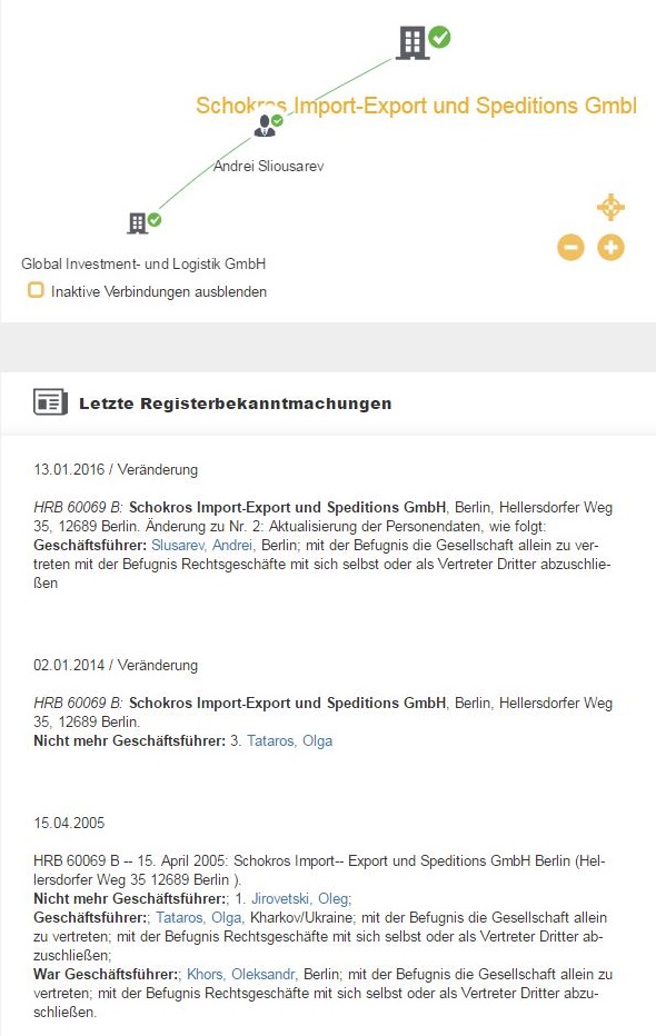 Німецька фірма «Schokros Import & Export und Spedition» зареєстрована в Берліні. Вона має спільний номер телефону +49 30 27591121 із бухгалтерською компанією «Global Investment- und Logistik».