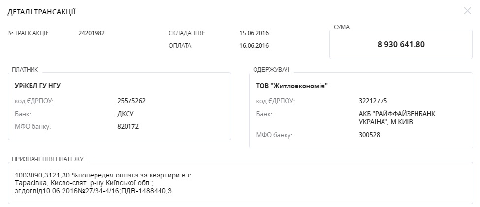 На порталі публічних фінансів є інформація, що 16 червня управління Нацгвардії перерахувало компанії «Житлоекономія» 8,93 млн грн. як 30% передоплати за квартири в селі Тарасівка Києво-Святошинського району.