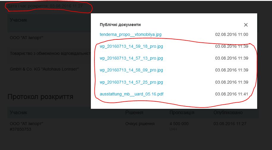 Німецька компанія надала у складі конкурсної пропозиції детальну інформації щодо автомобіля включно з його фотографіями. Замовник вимагав, аби ці дані були підгружені учасником до заявки лише у разі перемозі в торгах.