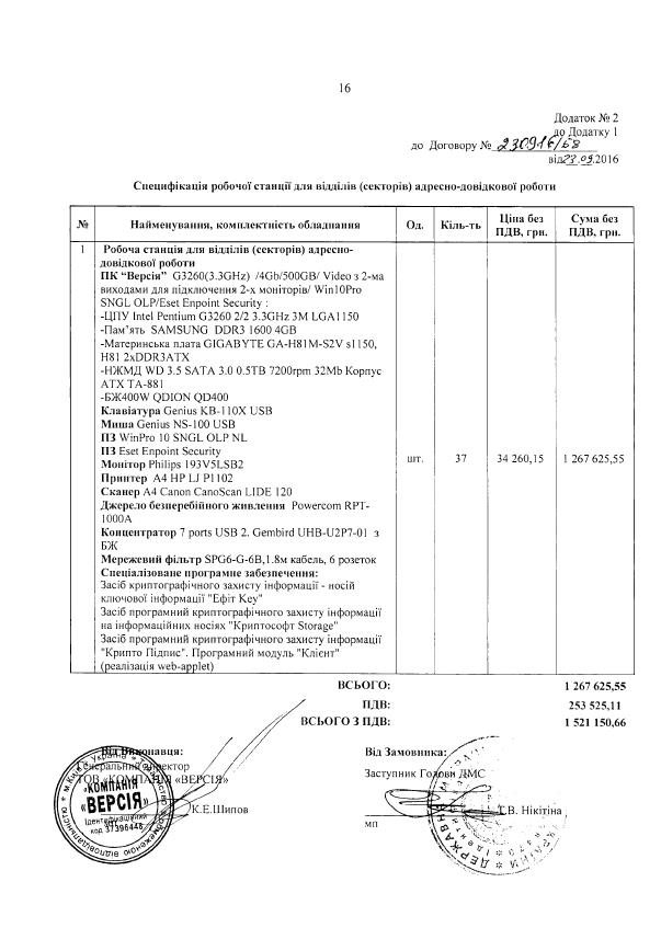 Робоча станція для відділів (секторів) адресно-довідкової роботи | 37 | 41 112,18 | 1 521 150,66 |
