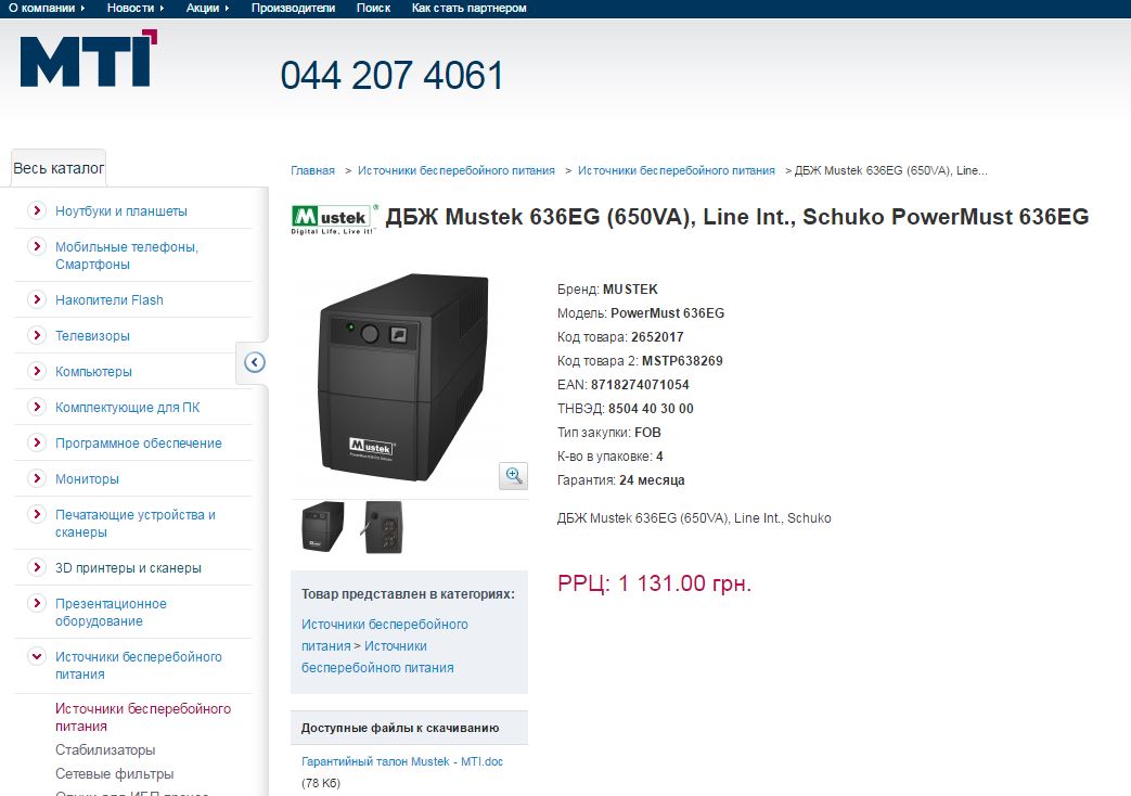 Джерела безперебійного живлення Mustek 636EG (650VA) Line Int. Schuko PowerMust 636EG придбали по 1 020 грн., тоді як на сайті «МТІ» вони на 10% дорожчі – по 1 131 грн.