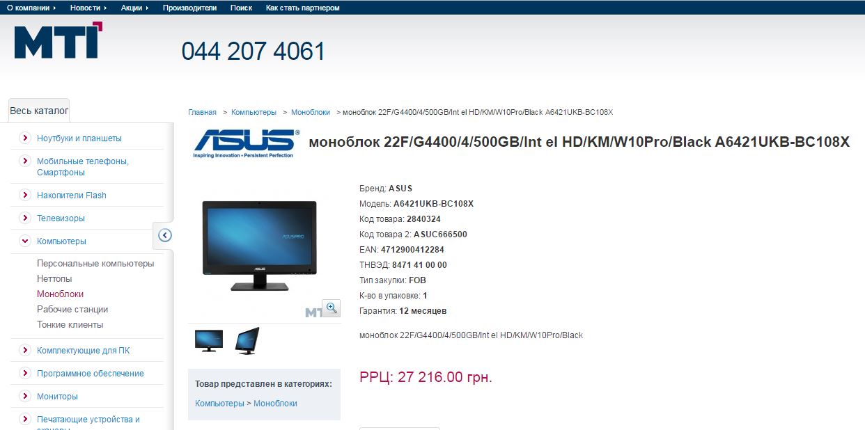 Моноблоки ASUS 22F/G4400/4/500GB/Intel HD/KM/W10Pro/Black A6421UKB-BC108X купили по 17 974 грн. На сайті переможця вони коштують на 33% дорожче – 27 216 грн.