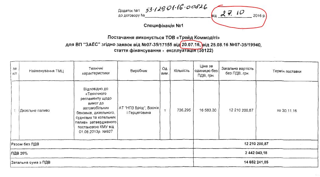 При цьому до контракту додано специфікації, у яких вказано, що «Трейд коммодіті» поставляє дизель виробництва НПЗ «Брод» (Боснія і Герцеговина) згідно заявки від 20 липня. Тобто ще навіть до оголошення самого тендеру 17 серпня.