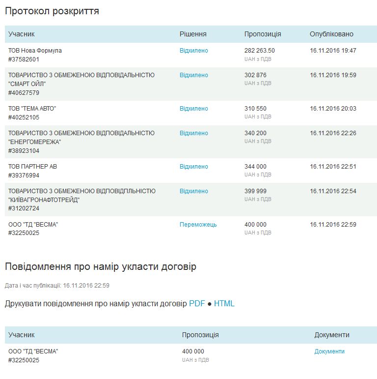 Наприклад, найдешевшу пропозицію ТОВ «Нова формула» ціною 282 тис грн. відхилили через відсутність усіх сертифікатів та митних декларацій, відсутність номерів розрахункових рахунків у банківській гарантії та інші претензії.