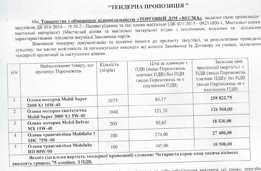 У техзавданні на тендер було вказано, що поліція бажає придбати оливи марки Mobil або еквівалент. Відхилені фірми пропонували інші імпортні масла, у тому числі виготовлені в країнах Євросоюзу. «Весма» запропонувала саме ті марки, які і вказувала поліція у техзавданні.