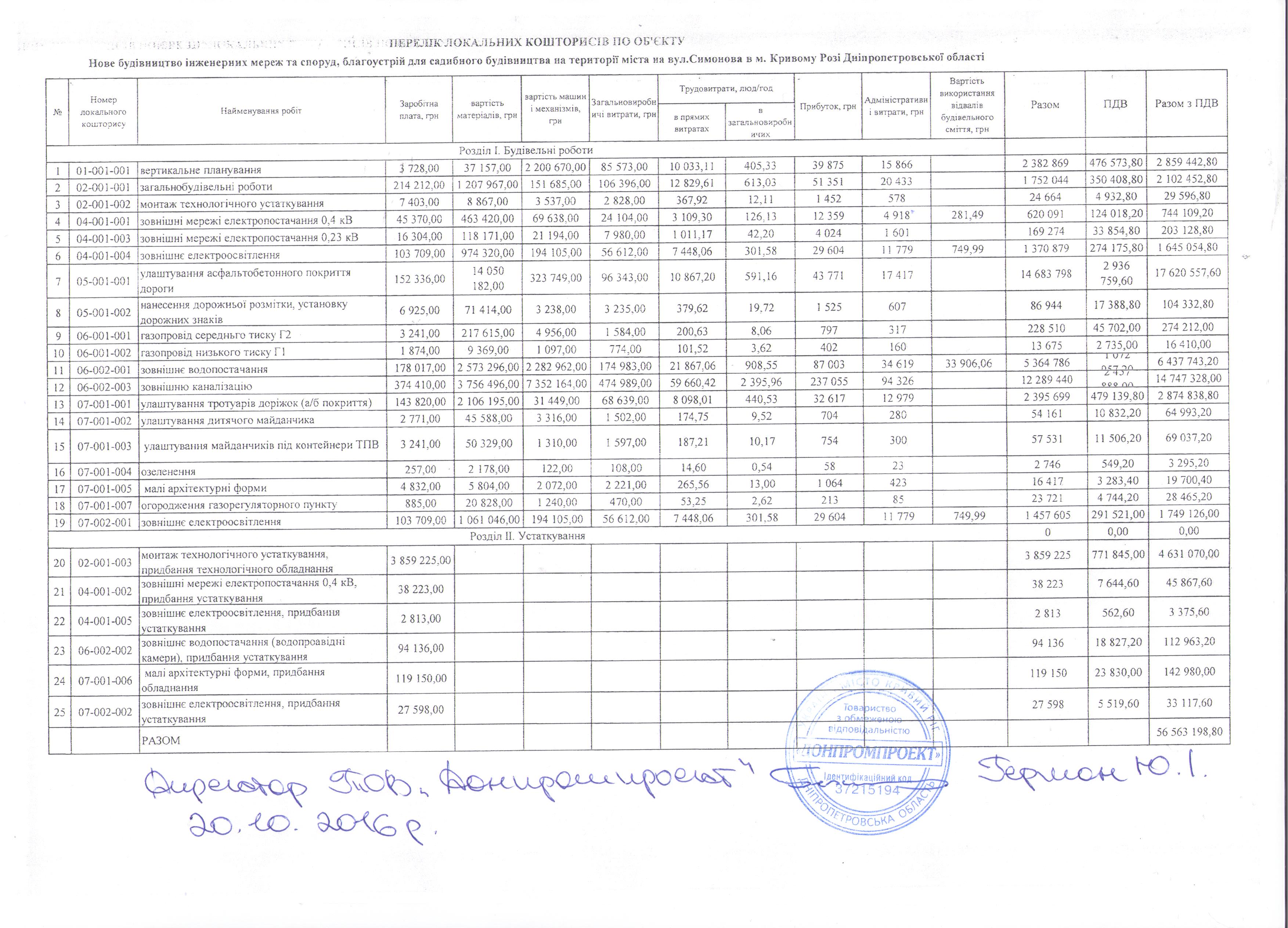 Протокол узгоджених цін на матеріальні ресурси не був опублікований, відтак їх неможливо порівняти з ринковими цінами на предмет завищення. Згідно переліку кошторисів, найдорожче коштують дорожнє покриття – 17,62 млн грн. і зовнішня каналізація – 14,75 млн грн. Дитячий майданчик обійдеться в 65 тис грн.