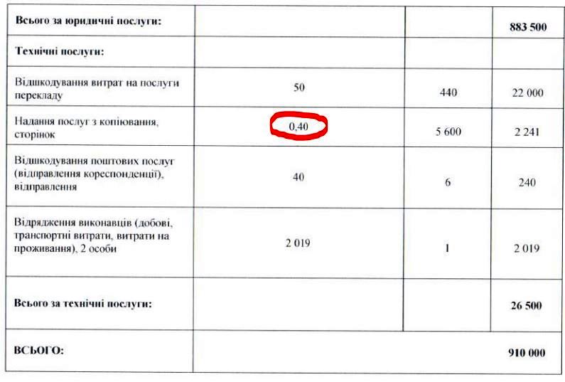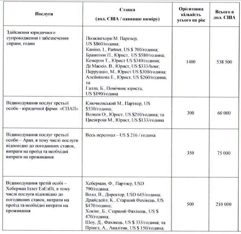 Найдорожче коштують послуги партнера «White & Case LLP» Майкла Полкінгхорна – $860 за годину. Також кошторис включає копіювання 5 600 сторінок документів по $0,4 за кожну.