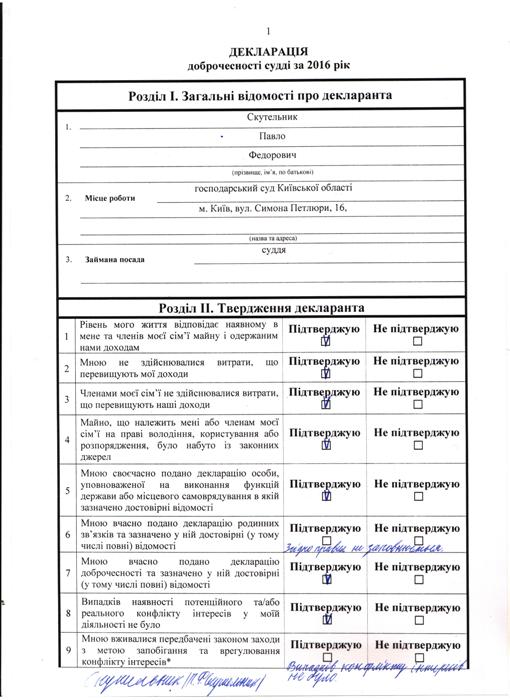 Суддя Господарського суду Київської області Павло Скутельник у декларації доброчесності за 2016 рік вказав на випадки втручання у його діяльність по здійсненню правосуддя. Копія декларації судді є у розпорядженні «Наших грошей».