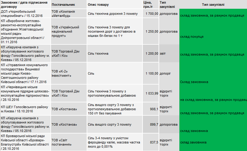 Аналогічним чином виписані договори ще мінімум у десяти учасників рейтингу, зокрема і в чернівецьких шляховиків, котрим ТОВ «ТД «КИП і Ко» привезе сіль за 1200 км по ціні 1034 грн за тону, що на 45% менше ціни ТОВ «Фортех» для Золотоноші, що віддалена від Солевару лише на 580 км., – 1850 грн./т.