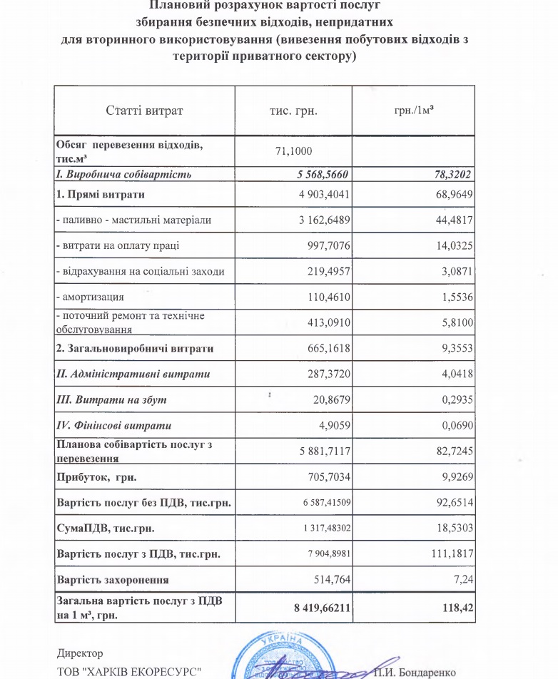Комунальники обрали «Харків Екоресурс» переможцям тендеру й уклали з фірмою дві угоди на вивіз сміття протягом року. Вартість договору склала 18,42 млн грн. А ціни за вивіз 1 кубометру сміття були вищі за інші регіони.