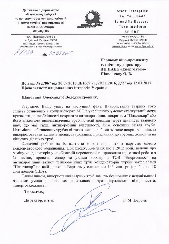 Зварні труби у конденсаторах АЕС, на відміну від безшовних, доведеться повністю покривати антикорозійним покриттям за ціною самого конденсатора. Про це повідомив директор ДП «НДКТІ трубної промисловості ім. Я.І. Осади» Радомір Король листом технічному директору ДП «НАЕК «Енергоатом» Олександру Шавлакову.