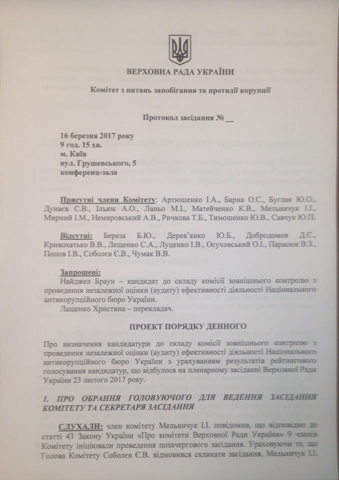 Частина депутатів з комітету Верховної Ради України з питань запобігання і протидії корупції сьогодні ранком провели засідання і склали протокол цього заходу. Копію документу опублікував Віталій Шабунін, голова правління «Центру протидії корупції».