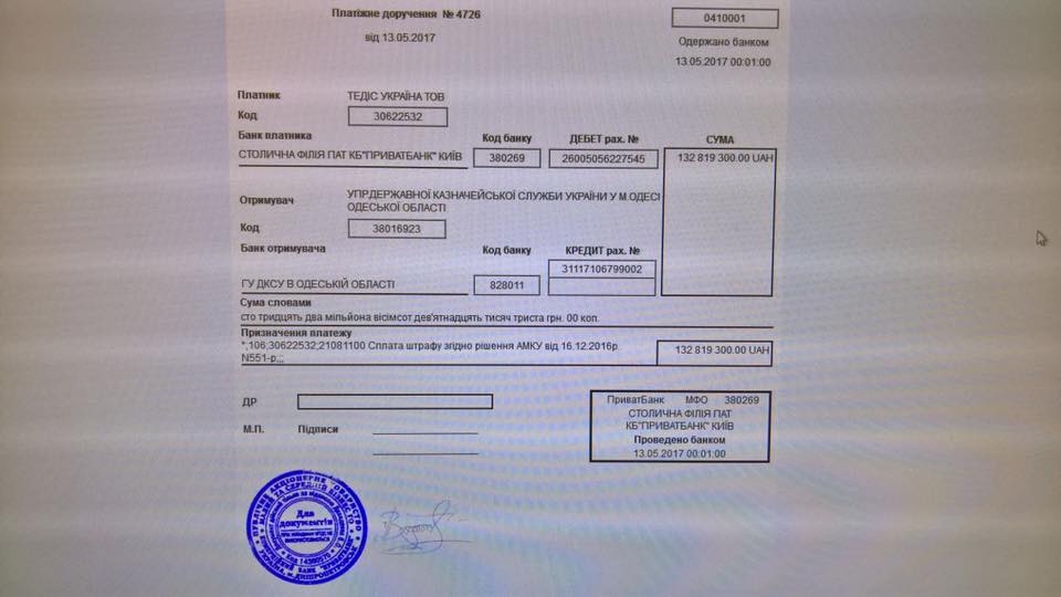 26 квітня генеральний прокурор Юрій Луценко повідомив, що «Тедіс Україна» сплатила штраф в розмірі 300 млн грн. З оприлюднених Луценком платіжних доручень відомо, що «Тедіс Україна» перераховував кошти зі своїх рахунків в «Ощадбанку» та в «Приватбанку». При цьому з судового реєстру було відомо, що напередодні заяви Луценка Генпрокуратура отримала судовий дозвіл на арешт щонайменше одного з рахунків «Тедіса», з якого нібито переховувся штраф у бюджет.