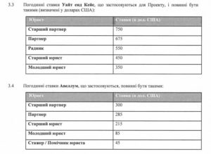Найдорожче коштують послуги старшого партнера «White & Case LLP» – $750 на годину, а найнижчою є погодинна ставка молодшого юриста – $350. Погодинні ставки «Авеллум Партнерс» різняться від $45 у помічника юриста до $300 у старшого партнера.