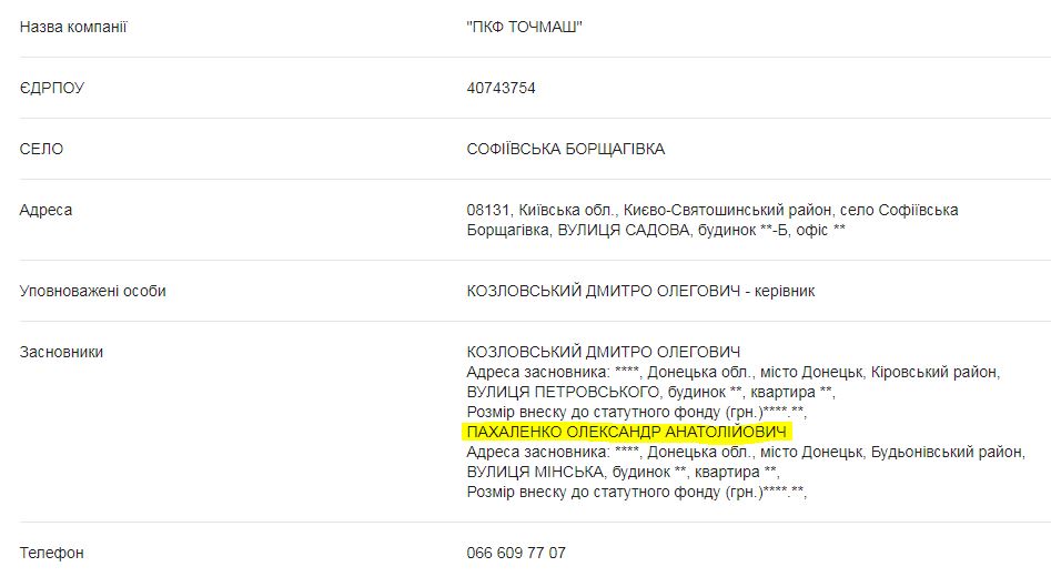 Суперник «ПКФ Точмаш» зареєстрований у серпні 2016 року за адресою масової реєстрації у Софіївській Борщагівці – вулиця Садова, будинок 16-Б, офіс 5. Засновниками фірми зі статутним капіталом 1 тис грн. є донеччани Дмитро Козловський і Роман Іваненко. Частка останнього донедавна належала Олександру Пахаленку.