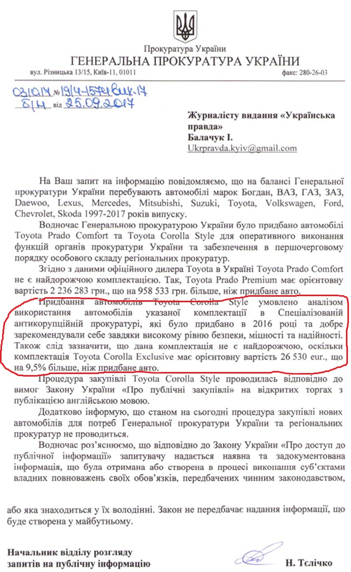 У вересні «Наші гроші» опублікували новину, що Генпрокуратура України купила 15 автомобілів Toyota Corolla на загальну суму 10 мільйонів, вказавши,  що ГПУ вибрала комплектацію Style, яка є найдорожчою, а кожен автомобіль прокурорам обійшовся у 619 тис грн.