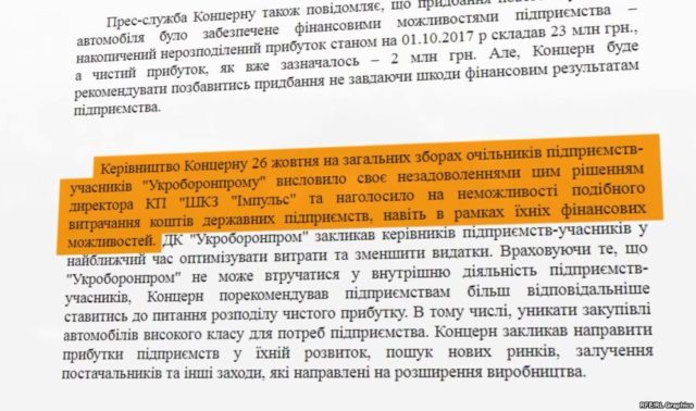 Керівництво Концерну 26 жовтня на загальних зборах очільників підприємств-учасників «Укроборонпрому» висловило своє незадоволення рішенням директора КП ШКЗ «Імпульс» про придбання коштовного авто, та наголосило на неможливості подібного витрачання коштів держпідприємств, навіть в рамках їхніх фінансових можливостей. Водночас, в держконцерні зауважили, що не можуть втручатися у внутрішні справи заводу.