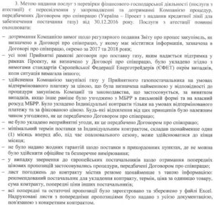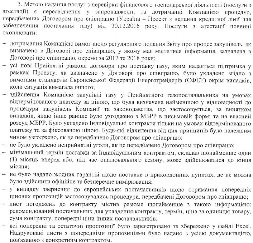 Під перевіркою мається на увазі складання двох атестаційних звітів із питань закупівель за серпень-грудень 2017 року і за 2018 рік для передачі в МБРР (детальний опис додано). Вона стосується індивідуальних договорів, укладених до рамкових договорів про поставку газу з європейськими постачальниками за результатами проведених процедур закупівлі.