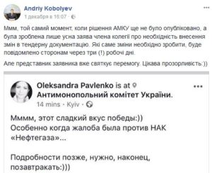 Далеко не кожен тендер “Нафтогазу” змушує Андрія Коболєва відреагувати на особистій сторінці. А друга поспіль поразка в АМКУ по дискримінаційним вимогам в тендері по оцінці – так.