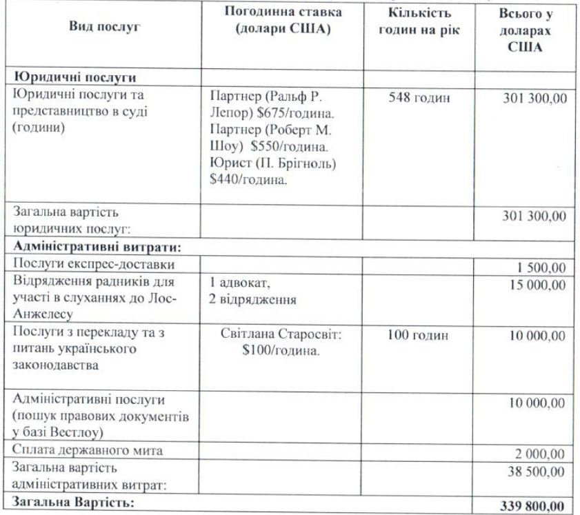 За кошторисом, найдорожчими є послуги партнера «Holland & Knight LLP» Ральфа Р. Лепора, які коштують $675 за годину. Послуги з перекладу та питань українського законодавства від Світлани Старосвіт обійдуться у $100 за годину.