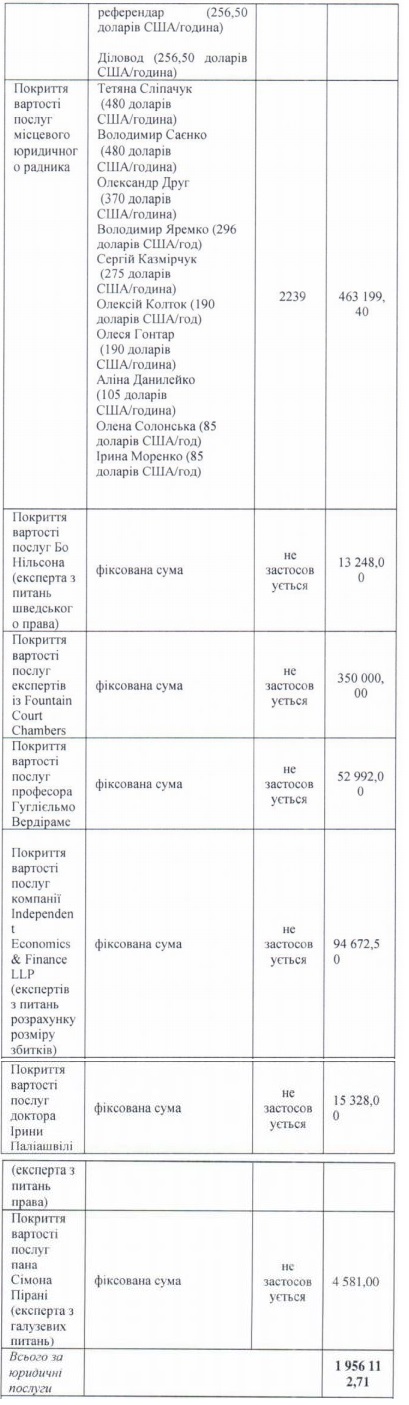 За кошторисом, фотокопіювання та друк пакетів документів коштує $0,1 за сторінку, а перекладацькі послуги – $50 за сторінку. У вересні в аналогічному договорі Мінюсту з «Latham & Watkins Llp» ціни становили відповідно $2 за сторінку і $40 за сторінку.