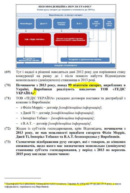 В рамках нового провадження було визнано, що у 2013-2015 роках через фірму проходило 99% цигарок. При цьому ці дані було встановлено і у розслідуванні попереднього скликання АМКУ, про що свідчить посилання у рішенні АМКУ нового скликання від 16 грудня 2016 року.