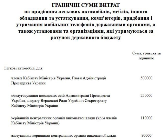 Нагадаємо, досі діє урядова постанова про граничні суми витрат на придбання легкових автомобілів, меблів, іншого обладнання та устаткування, останні зміни в яку вносились у серпні 2017 року. Цим документом передбачено, що для обслуговування членів Кабінету міністрів і Адміністрації президента можна купуати легкові автомобілі не дорожче від 500 тисяч гривень.