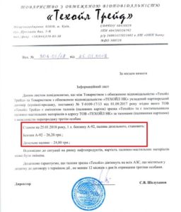Водночас у пакеті документів, що «Техойл НК» завантажив у систему «ProZorro» присутній інформаційний лист (від 25.01.2018) за підписом директора ТОВ «Техойл Трейд», з яким має договірні стосунки про постачання паливно-мастильних матеріалів. І там вказана ціна на бензин та дизпаливо.