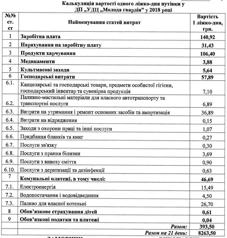 В 2013 році путівки коштували 4 460 грн., або 212 грн. за ліжко-день. В 2017 році путівки коштували відповідно 8 190 грн. і 7 266 грн., що на 13% дешевше. За калькуляціями, здорожчання відбулось переважно за рахунок збільшення зарплат.