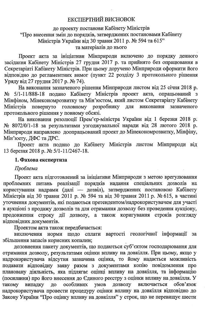 Натомість урядові експерти розкритикували ініціативу міністерства. В експертному висновку вказано, що запропонована норма передбачає передачу спецдозволу шляхом внесення змін до статутного капіталу іншій юридичній особі з подальшим «розмивом» (зменшенням частки попереднього власника). Експерти вказали, що таким шляхом в 2004 році з державної НАК «Надра Україна» було виведено понад 20 спецдозволів.
