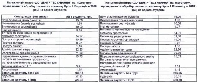 Решта витрат різняться: друк екзаменаційних буклетів, інші матеріали, організація та проведення екзамену прокторами, оплата праці працівників Центру тестування, відрахування соціального внеску. Наприклад, послуги прокторів для іспиту «Крок 1» із фармації для вітчизняних студентів коштують 25 грн., а для іноземних – 54 грн.: