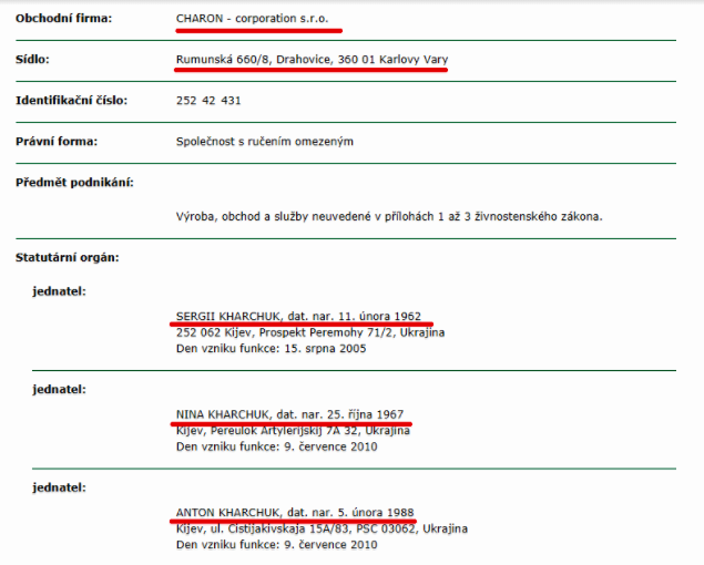 Фірма Харчука «Charon – corporation s.r.o.» існує з 2000 року, а володіють і керують нею Сергій Харчук, Ніна Харчук та Антон Харчук. Зареєстрована компанія за тією ж чеською адресою, що й квартира депутата.