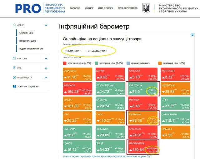 Інфляційний барометр від платформи ефективного регулювання дає інформацію щодо середнього здорожчання по Україні у період з 26 лютого по 19 квітня (часові рамки укладених додугод) курятини – на 0,34%, яловичини – на 11,51%, а свинини – на 6,12%.
