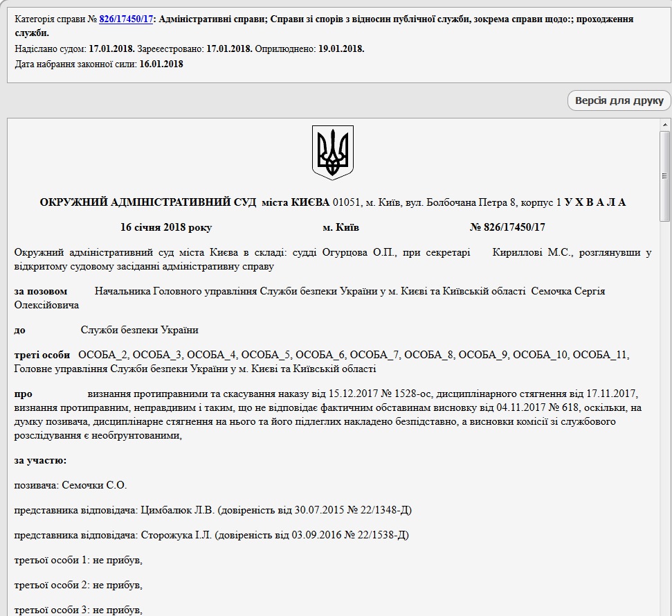 На початку січня цього року Окружний адмінсуд Києва прийняв до розгляду заяву начальника Головного управління Служби безпеки України у м. Києві та Київській області Сергія Семочка, який звернувся з позовом до СБУ, вимагаючи визнати протиправним накладення на нього і його підлеглих дисциплінарного стягнення наприкінці 2017 року.