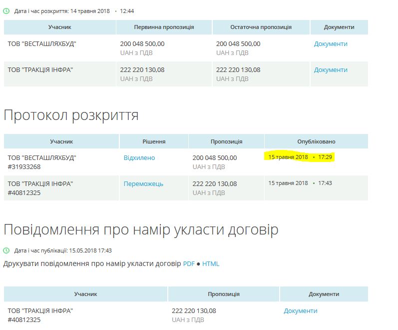 На торги прийшли три фірми: «Територія Д», ТОВ «Весташляхбуд» і ТОВ «Тракція Інфра». Однак замовник допустив до аукціону лише останні дві. «Весташляхбуд» запропонувало ціну в 200,05 млн грн., що на 20% нижче від очікуваної вартості закупівлі. «Тракція інфра» зупинилась на стартовій заявці 222,22 млн грн.