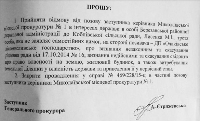 Але в іншій справі, про повернення землі державі її новим власником, до суду у 2017 році надійшла заява від заступника генпрокурора Анжели Стрижевської про відмову від позову.
