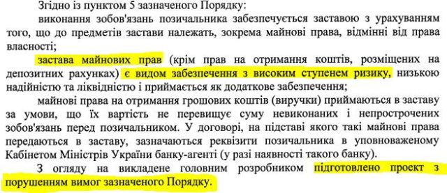 В свою чергу, урядові експерти піддали критиці ініціативу Міненерго. Вони вказали, що в квітні 2011 року Кабмін постановою №460 затвердив Порядок визначення розміру та виду майнового забезпечення під час надання кредитів (позик), залучених державою або під державні гарантії. І цей Порядок вважає заставу майнових прав видом забезпечення з високим ступенем ризику, надійністю та ліквідністю. Така застава може бути лише як додаткове забезпечення.