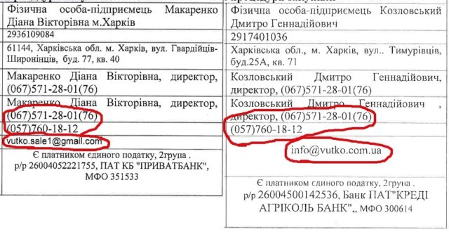 Адреси електронної пошти теж були схожі: у Макаренко – vutko.sale1@gmail.com, у Козловського – info@vutko.com.ua. Остання належить ТОВ «Східно-українська торгівельна компанія» Діани та Геннадія Макаренків.
