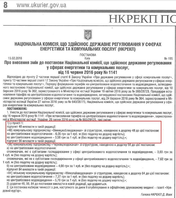 15 березня в газеті Кабміну були опубліковані рішення НКРЕКП №195 і №196, які вносять зміни в рішення про затвердження тарифів трьох ліцензіатів – комунальних підприємств «Вінницяоблводоканал», «Чернівціводоканал» та «Миколаївводоканал.
